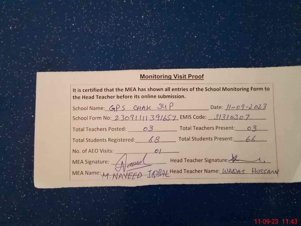 | Attendance Register | Head Teacher | MEA with School | Visit Proof |