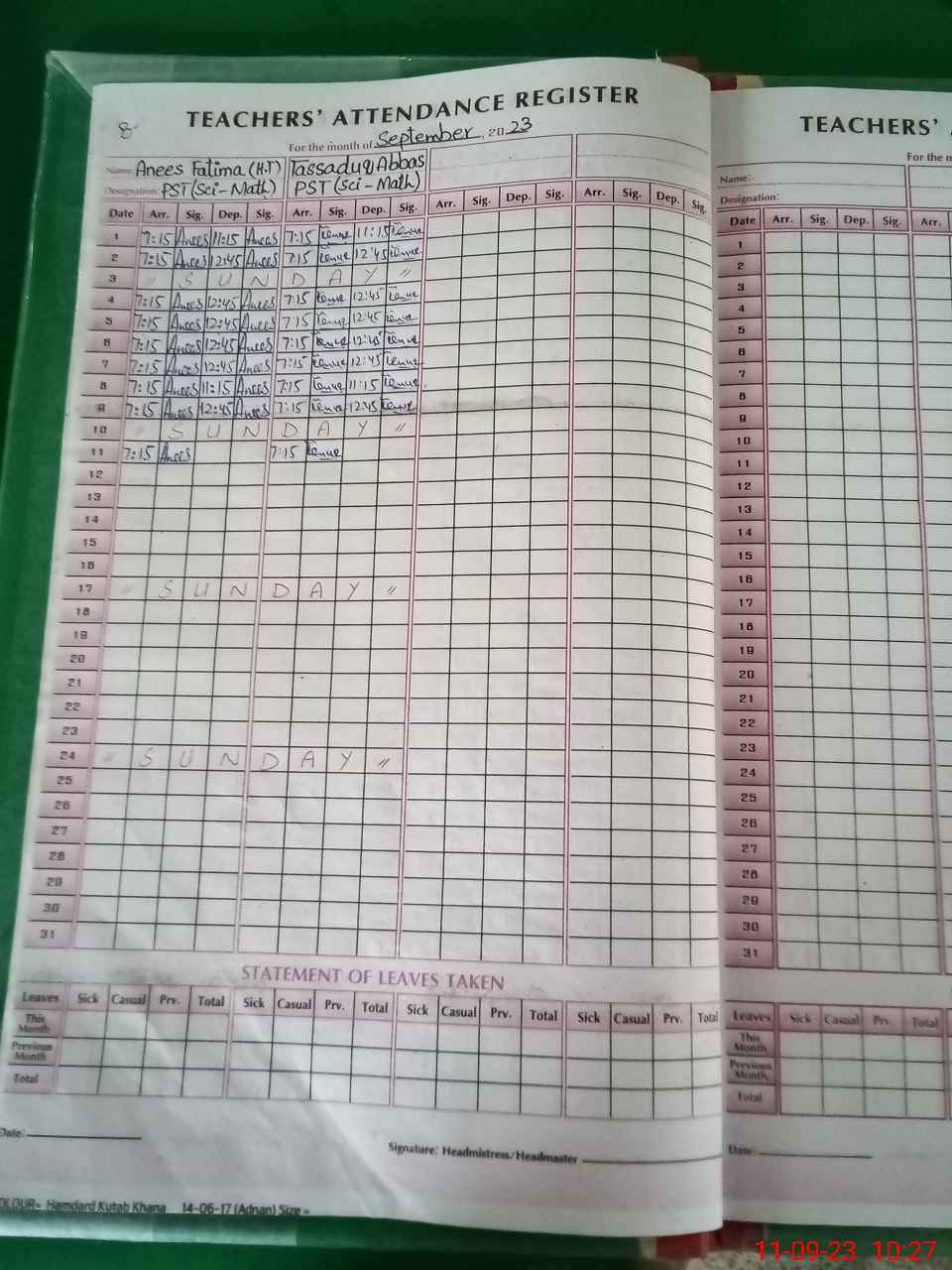 | Leave | Duty | Absent | Maternity | Medical | Ex- Pak |