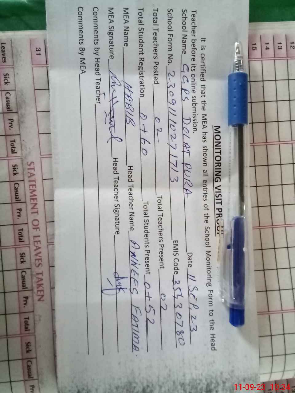 | Attendance Register | Head Teacher | MEA with School | Visit Proof |