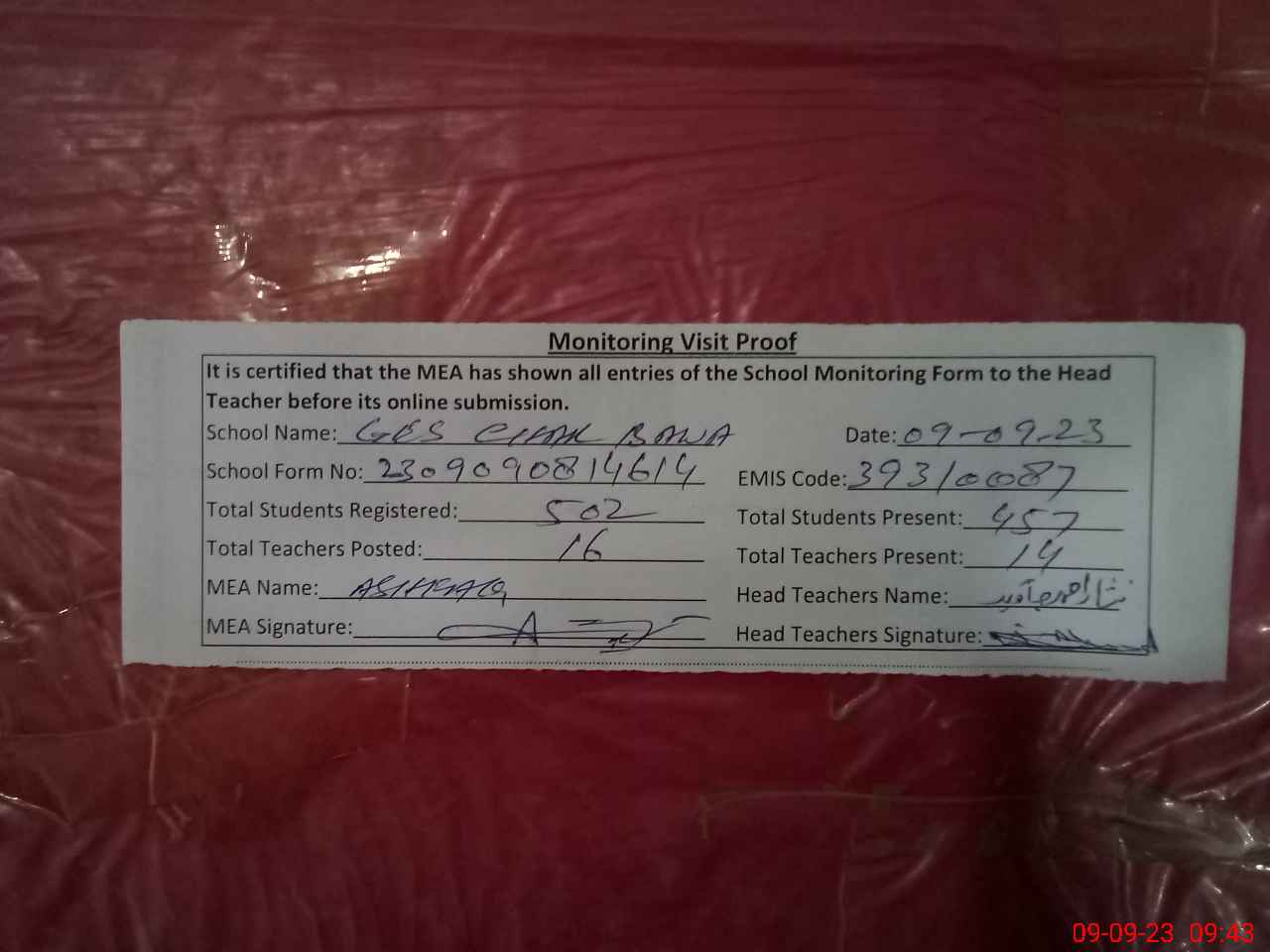 | Attendance Register | Head Teacher | MEA with School | Visit Proof |