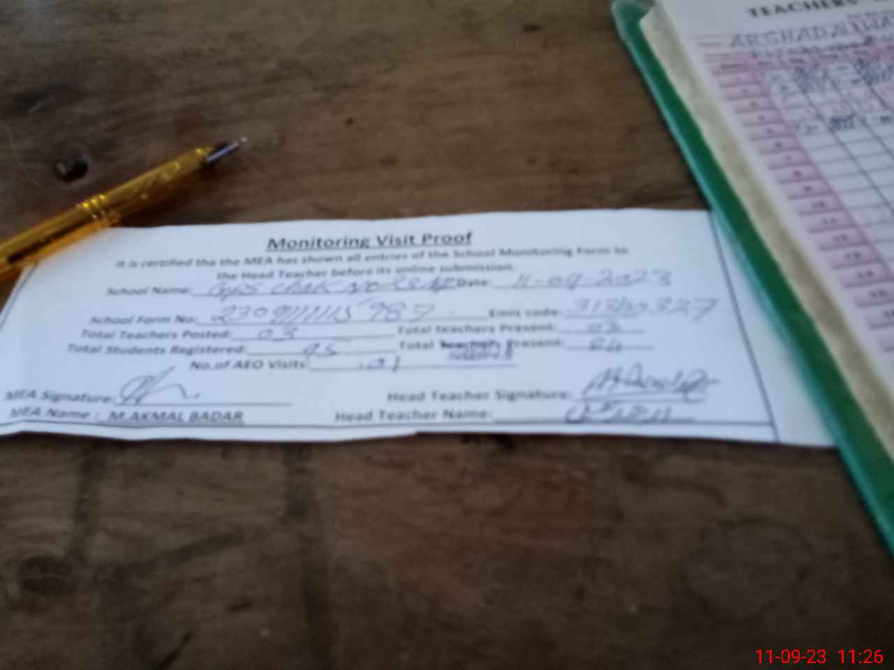 | Attendance Register | Head Teacher | MEA with School | Visit Proof |