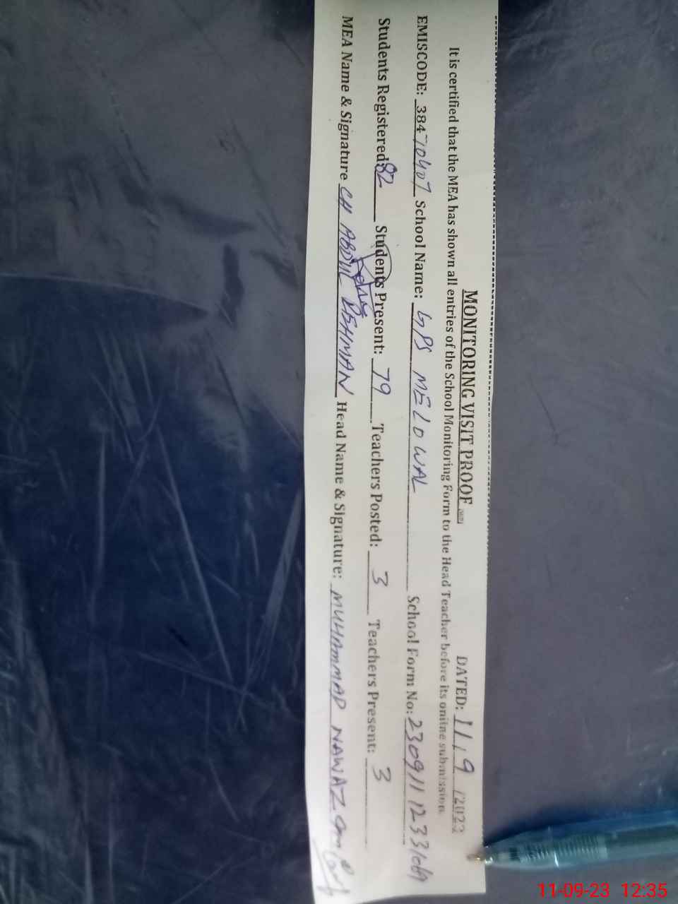 | Attendance Register | Head Teacher | MEA with School | Visit Proof |