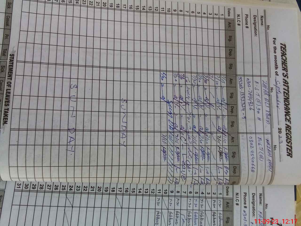 | Name: Za**** Al**** KH**** Designation: (School Headmaster's/Headmistress's) SST GENERAL Phone/Cell Number: 03**** |