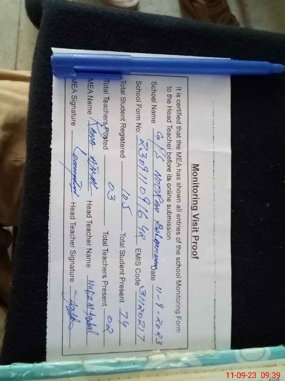 | Attendance Register | Head Teacher | MEA with School | Visit Proof |