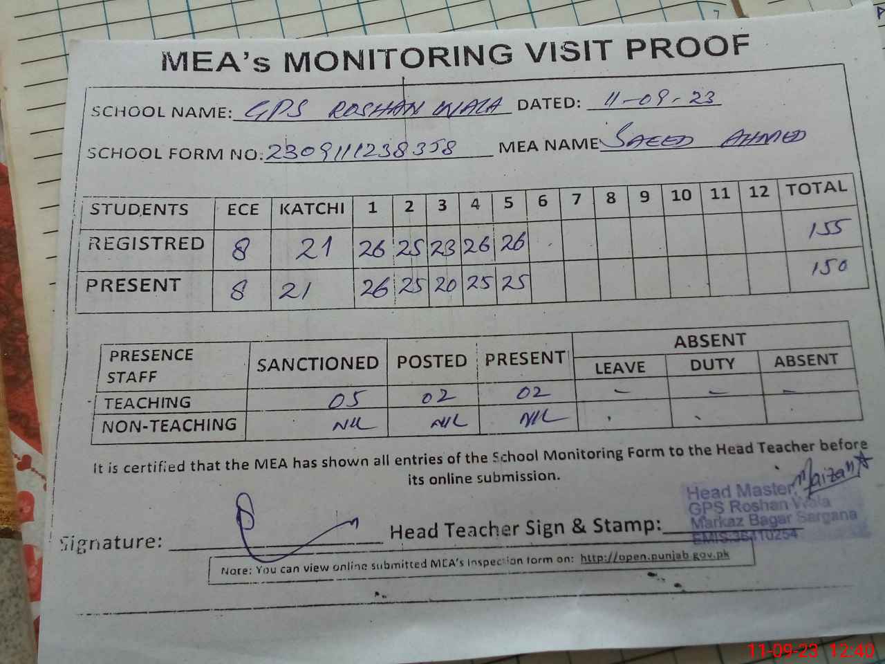 | Attendance Register | Head Teacher | MEA with School | Visit Proof |
