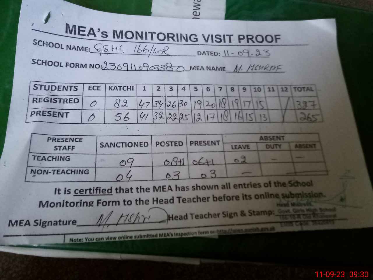 | Attendance Register | Head Teacher | MEA with School | Visit Proof |