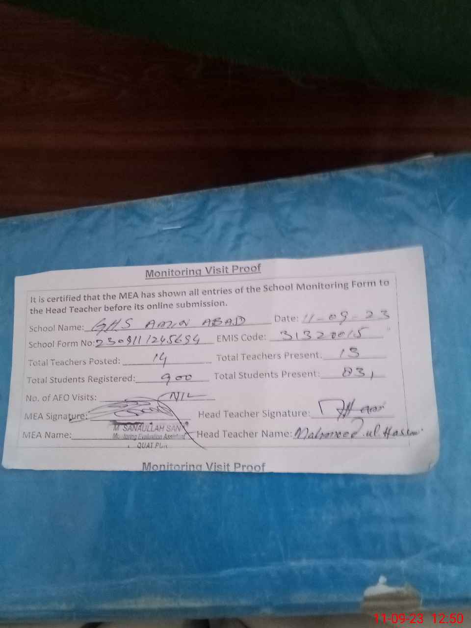 | Attendance Register | Head Teacher | MEA with School | Visit Proof |