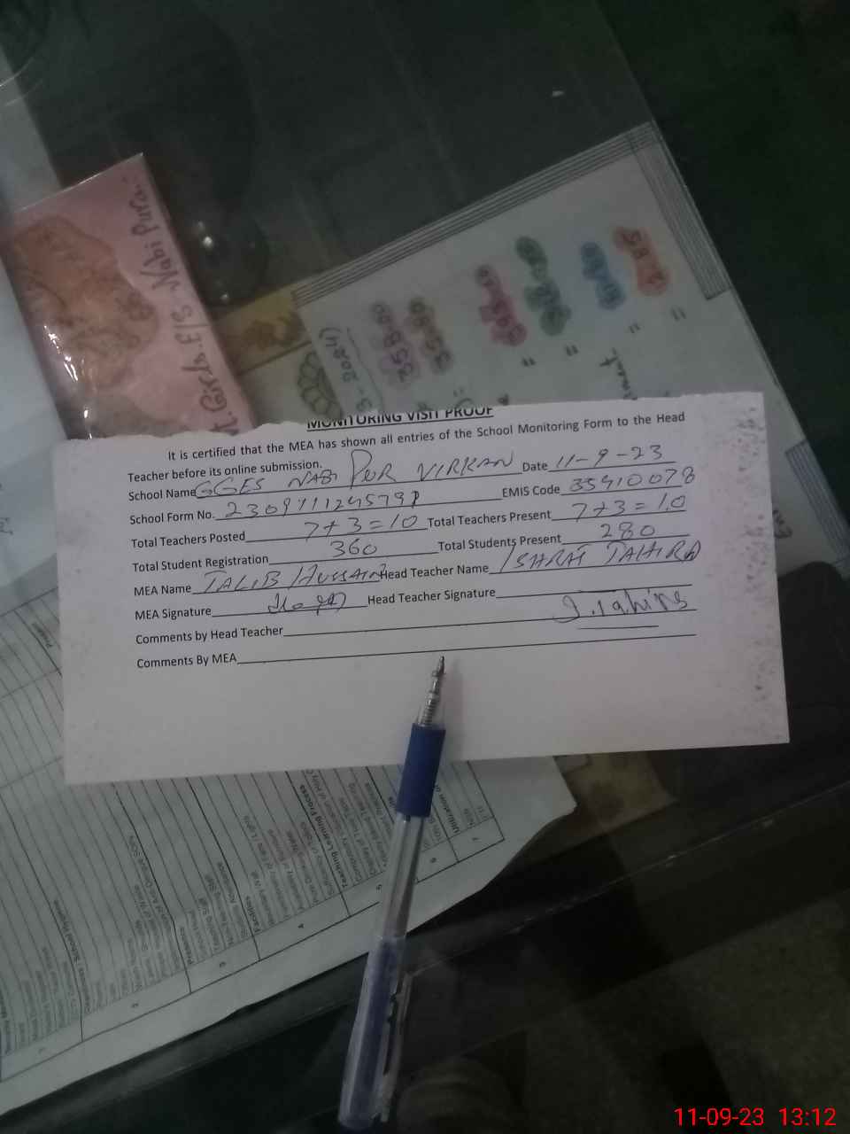 | Attendance Register | Head Teacher | MEA with School | Visit Proof |