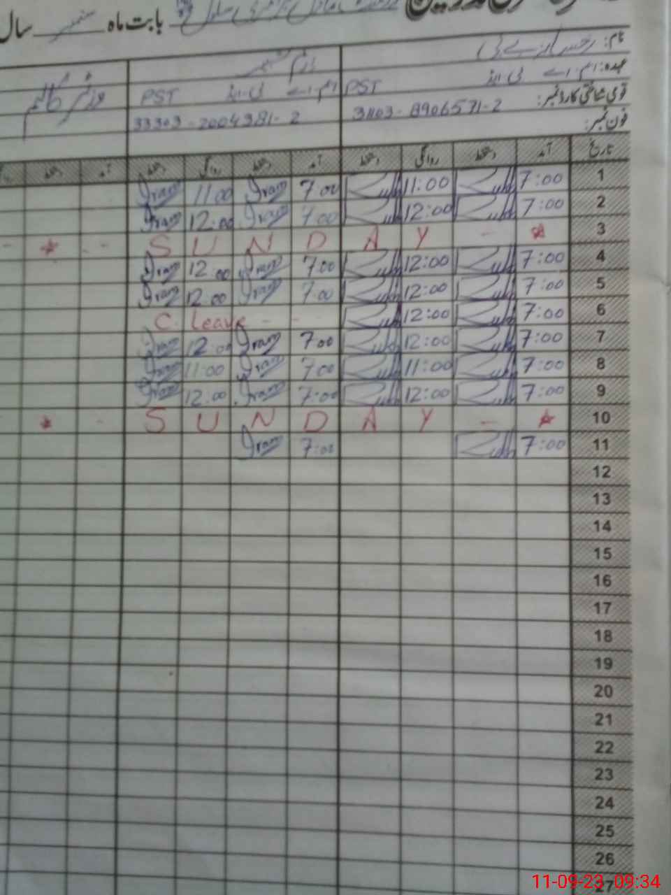 | CNIC | Full Name | Designation | R/C | Absence During Last Calender Month |