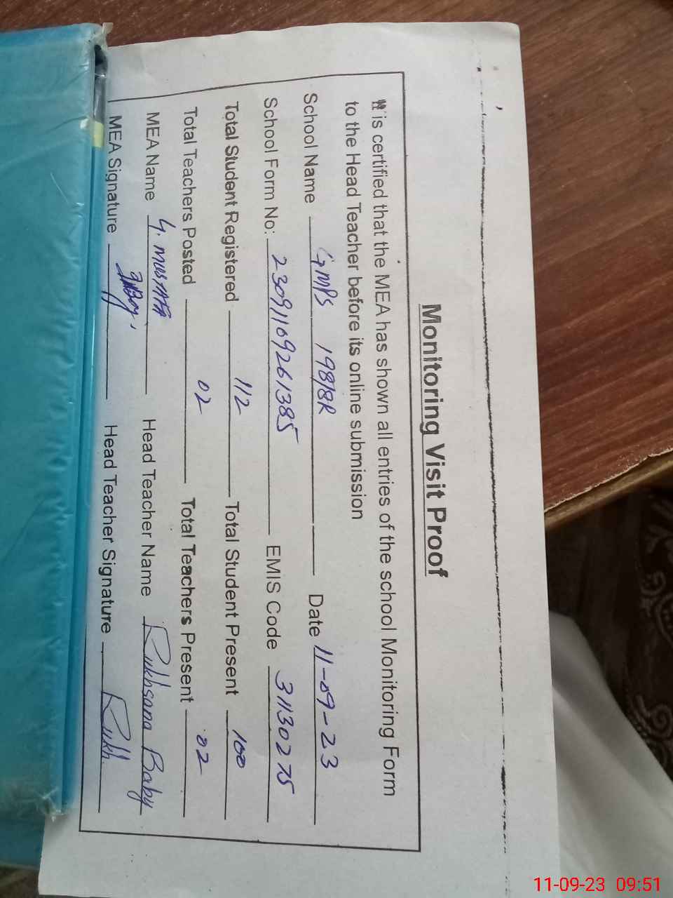 | Attendance Register | Head Teacher | MEA with School | Visit Proof |