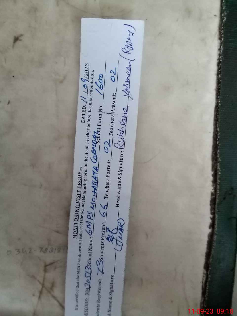 | Attendance Register | Head Teacher | MEA with School | Visit Proof |