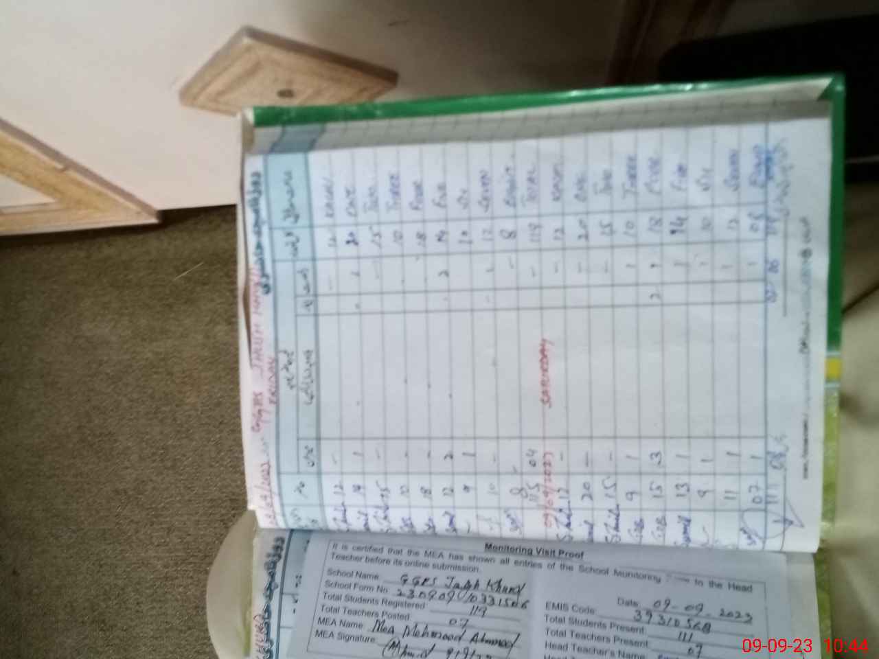 | Attendance Register | Head Teacher | MEA with School | Visit Proof |