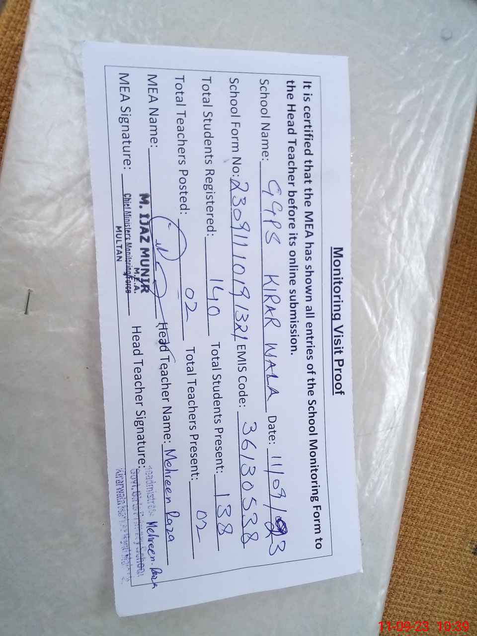 | Attendance Register | Head Teacher | MEA with School | Visit Proof |