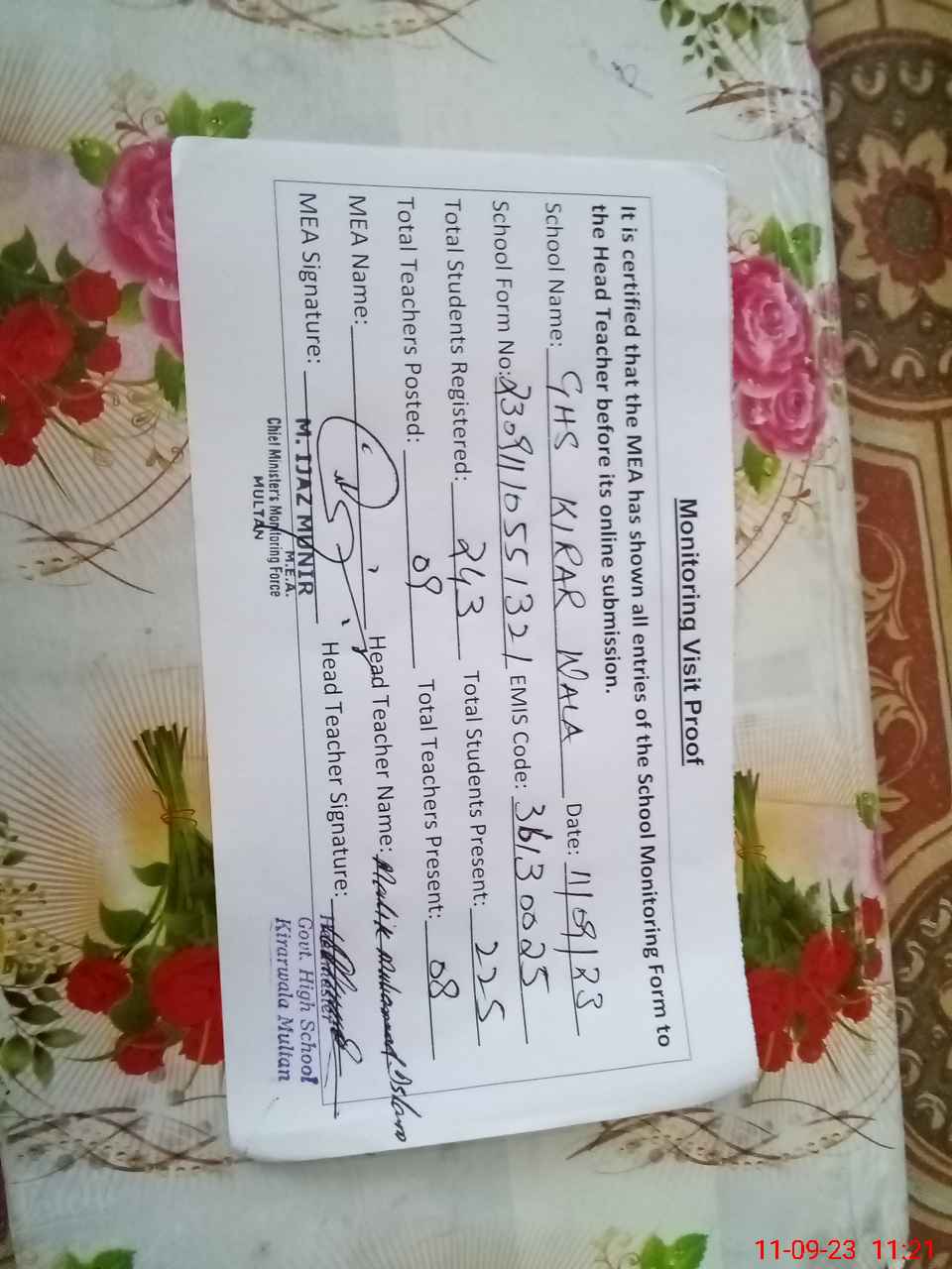 | Certified that this School was Inspected by the Undersigned MEA/DMO Today and the Information Stated Above is as Per Record. | |||||