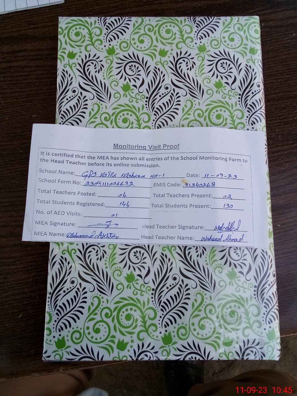 | Attendance Register | Head Teacher | MEA with School | Visit Proof |