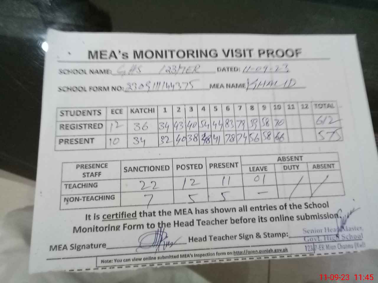 | Attendance Register | Head Teacher | MEA with School | Visit Proof |