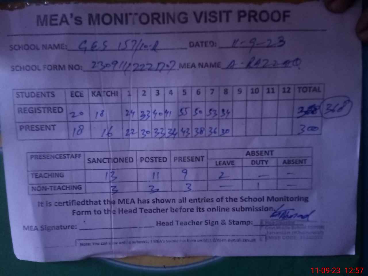 | Attendance Register | Head Teacher | MEA with School | Visit Proof |