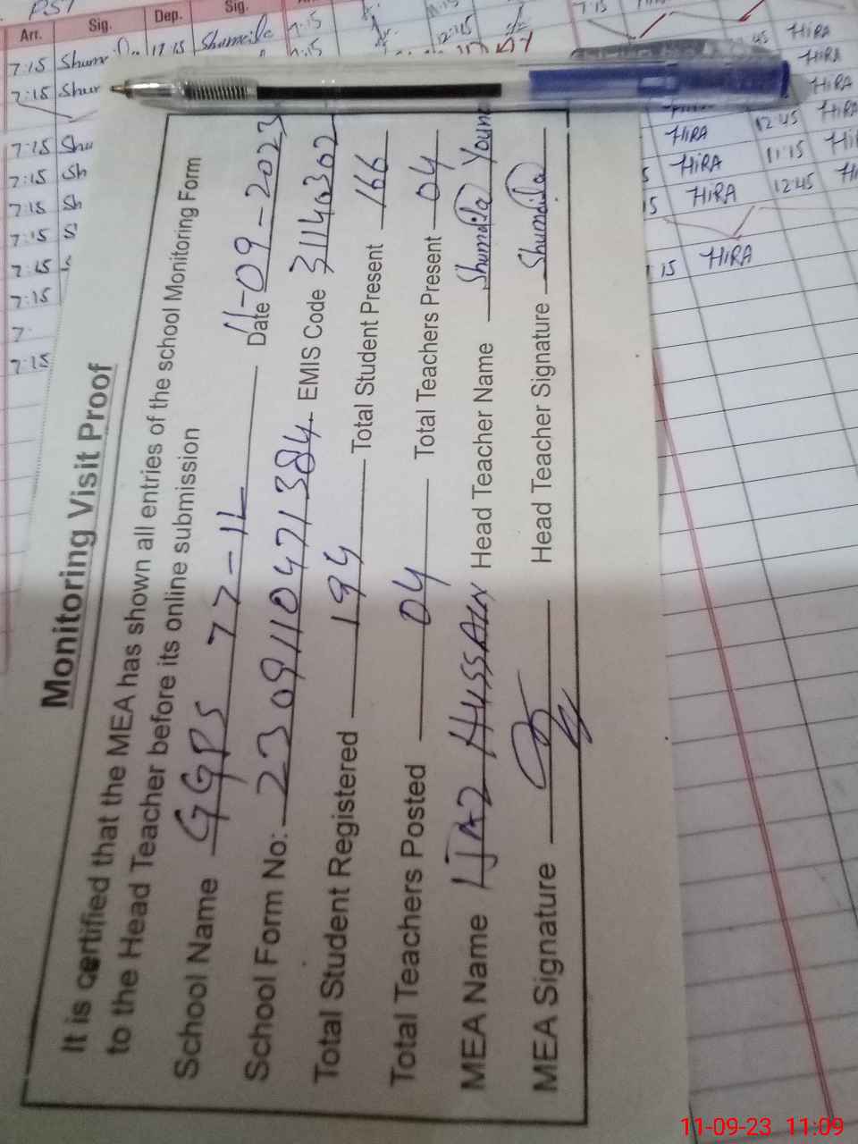 | Attendance Register | Head Teacher | MEA with School | Visit Proof |