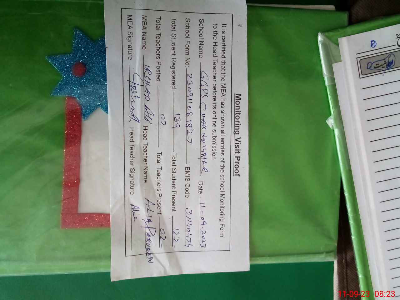 | Attendance Register | Head Teacher | MEA with School | Visit Proof |