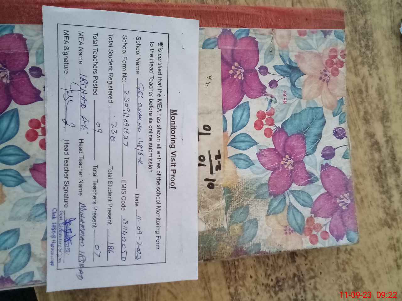 | Attendance Register | Head Teacher | MEA with School | Visit Proof |