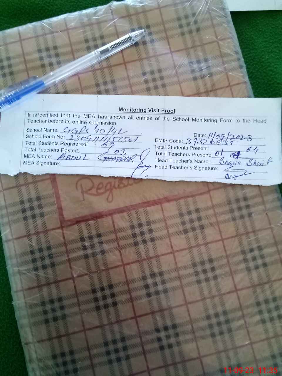 | Attendance Register | Head Teacher | MEA with School | Visit Proof |