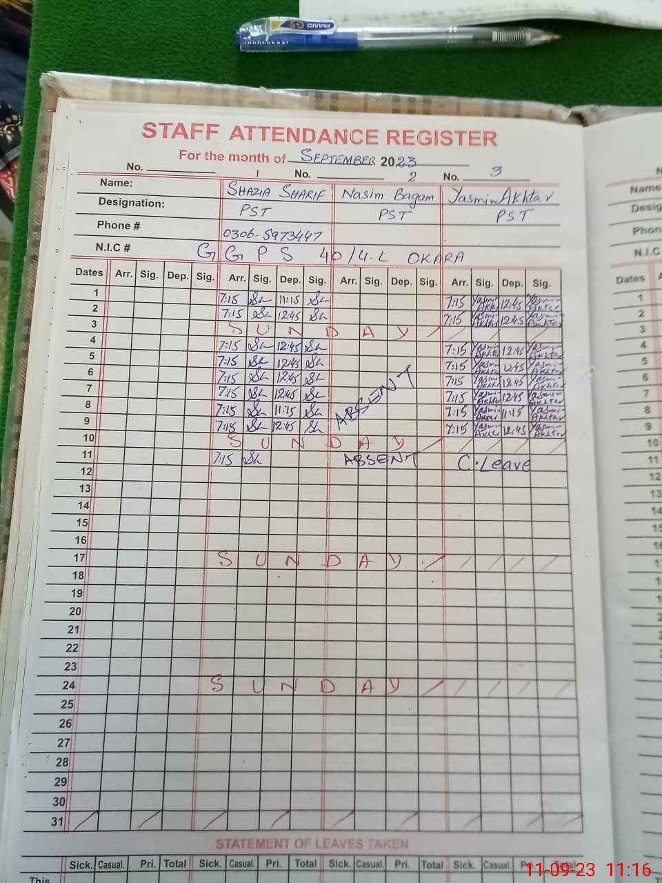 | CNIC | Full Name | Designation | R/C | Absence During Last Calender Month |