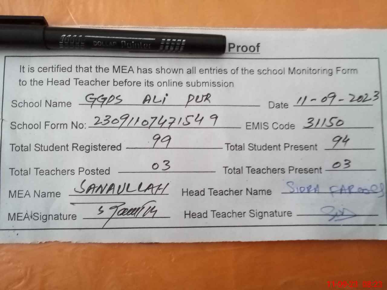 | Attendance Register | Head Teacher | MEA with School | Visit Proof |