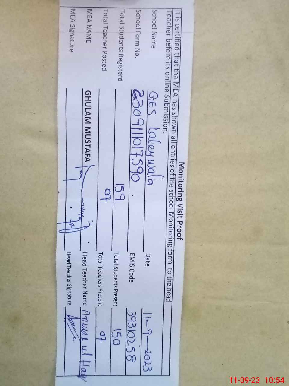 | Attendance Register | Head Teacher | MEA with School | Visit Proof |