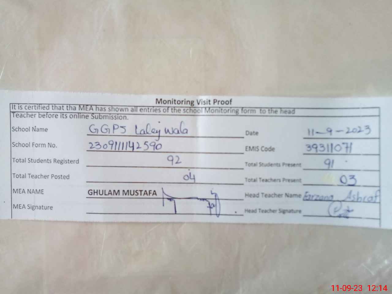 | EMIS Code: 39311071 | Name of School: GGPS LALAY WALA | |||