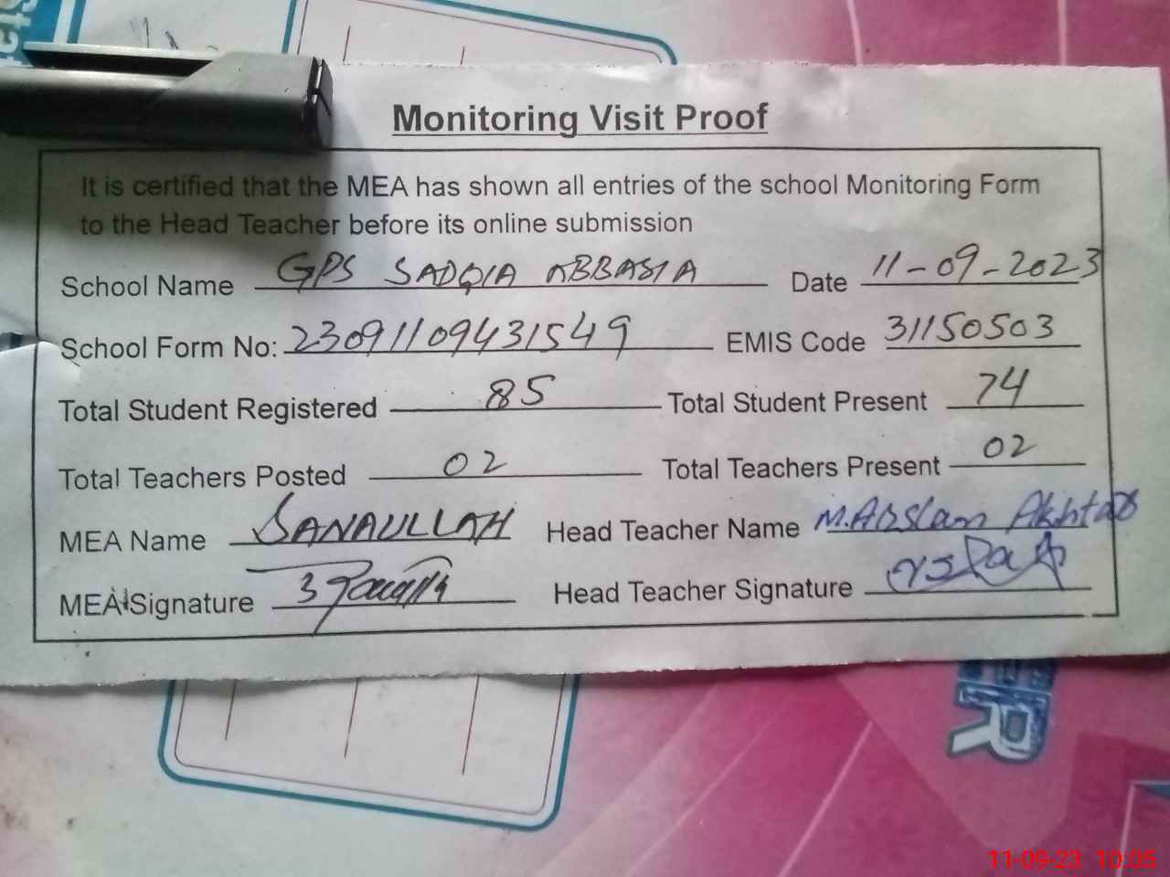 | EMIS Code: 31150503 | Name of School: GPS SADQIA MINCHINABAD | |||