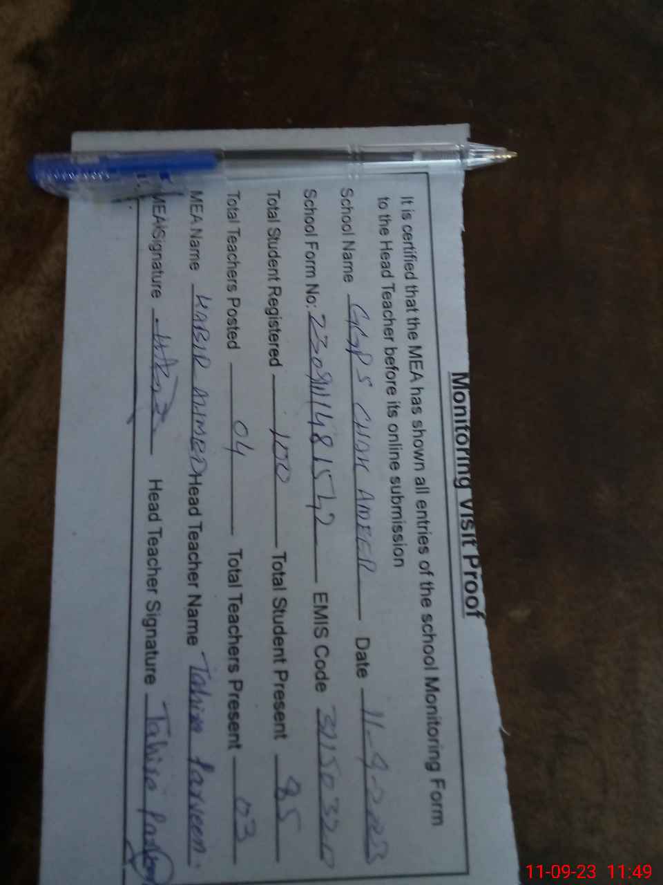 | Attendance Register | Head Teacher | MEA with School | Visit Proof |