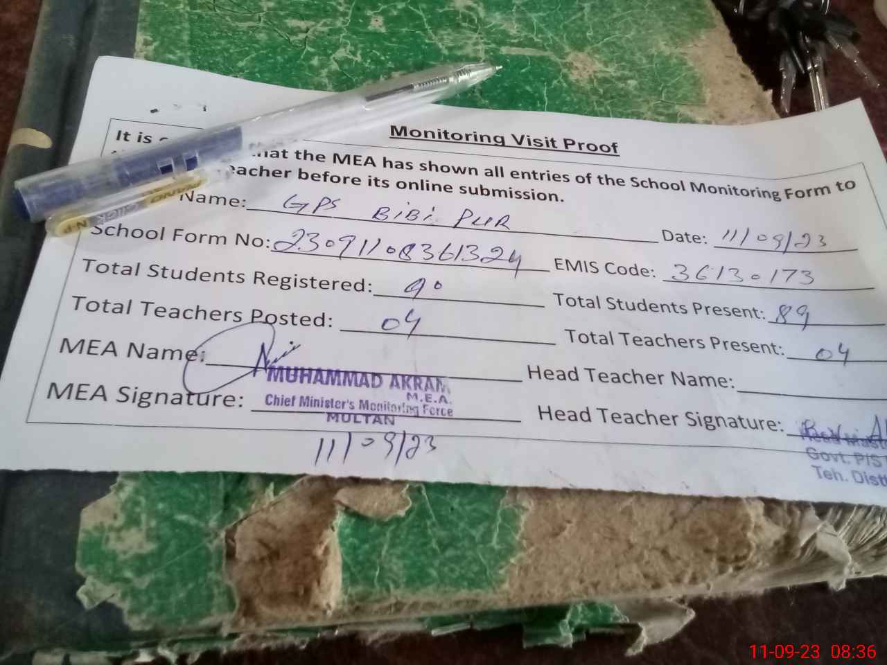 | Attendance Register | Head Teacher | MEA with School | Visit Proof |