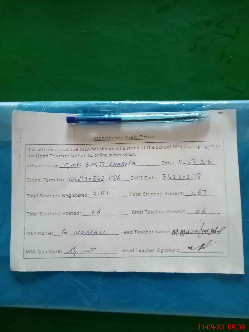 | Attendance Register | Head Teacher | MEA with School | Visit Proof |