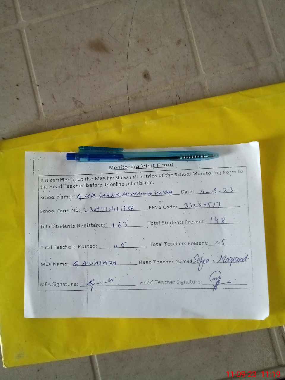 | Attendance Register | Head Teacher | MEA with School | Visit Proof |