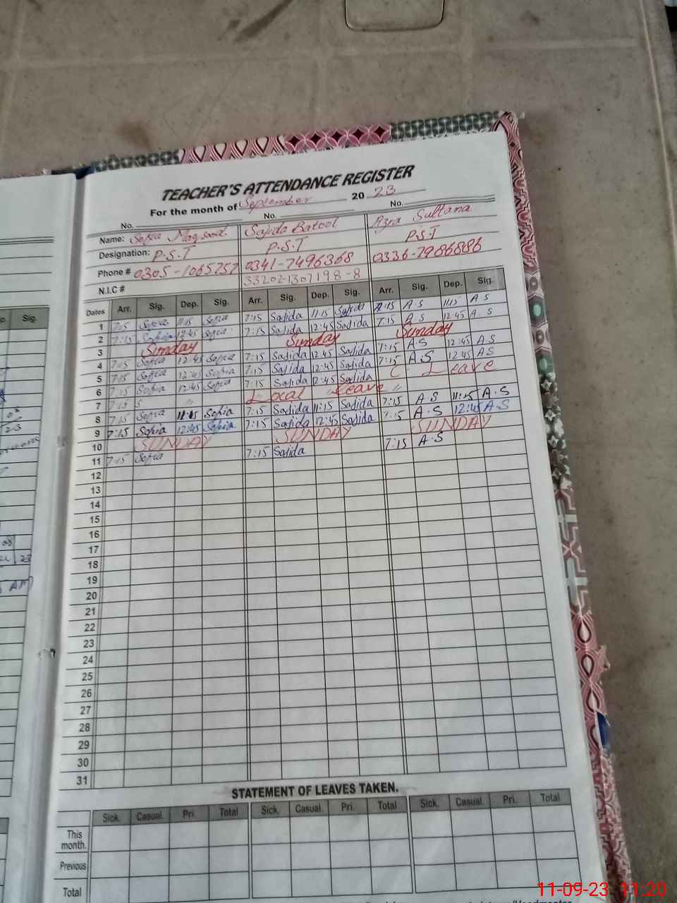 | CNIC | Full Name | Designation | R/C | Absence During Last Calender Month |