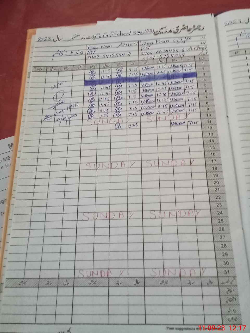 | Name: Uz**** Ki**** Designation: (School Headmaster's/Headmistress's) PST Phone/Cell Number: 03**** |