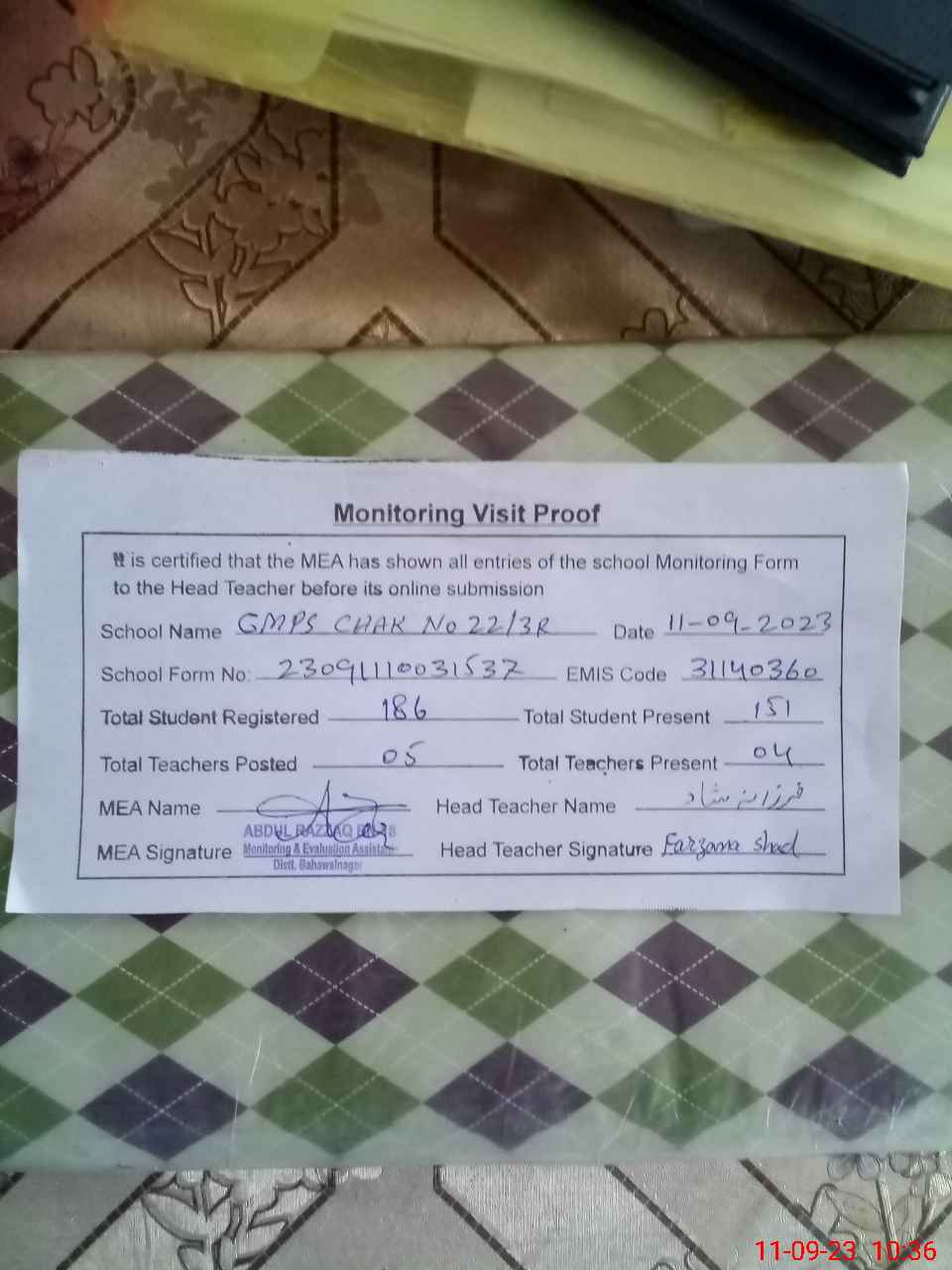 | EMIS Code: 31140360 | Name of School: GMPS CHAK NO. 22/3-R | |||
