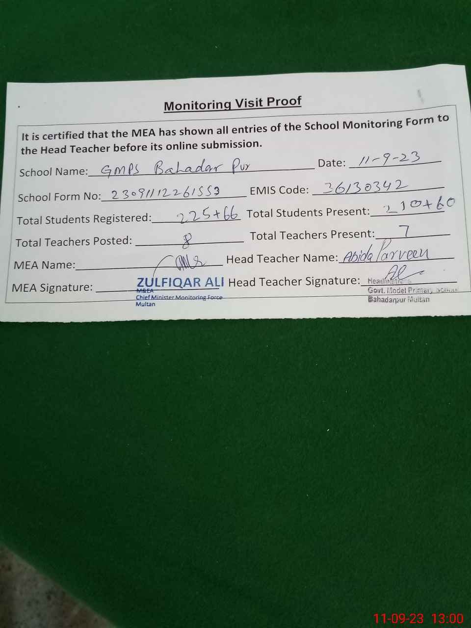 | Monitoring Date: 11-09-2023 | Start Time: 11-09-2023 12:26 PM | End Time: 11-09-2023 01:00 PM | Name of MEA: Zu**** Al**** | |
