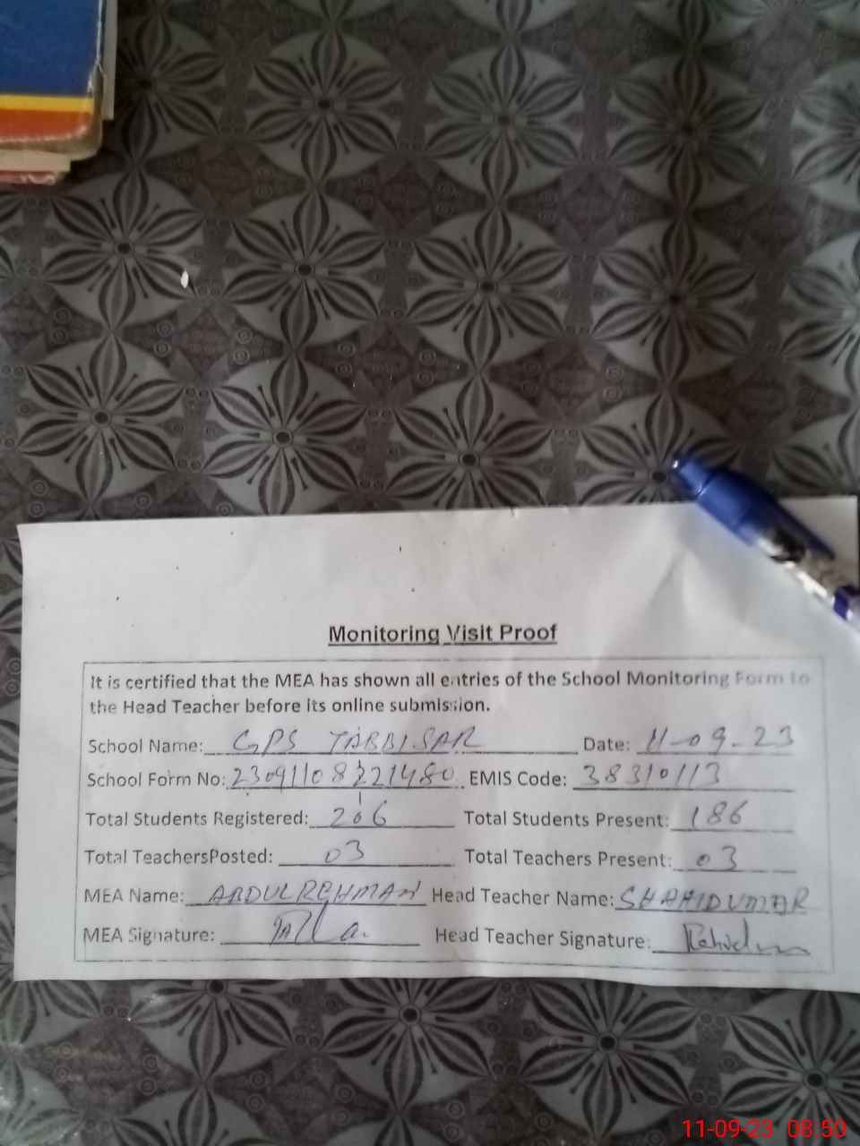 | Attendance Register | Head Teacher | MEA with School | Visit Proof |