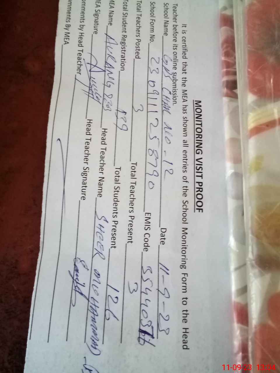 | Attendance Register | Head Teacher | MEA with School | Visit Proof |