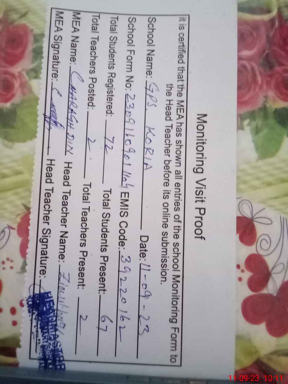 | Attendance Register | Head Teacher | MEA with School | Visit Proof |