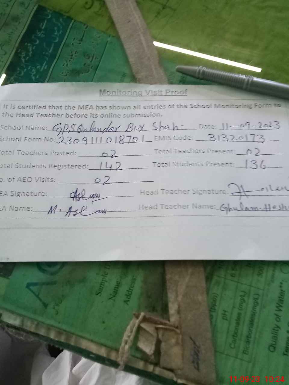 | Attendance Register | Head Teacher | MEA with School | Visit Proof |