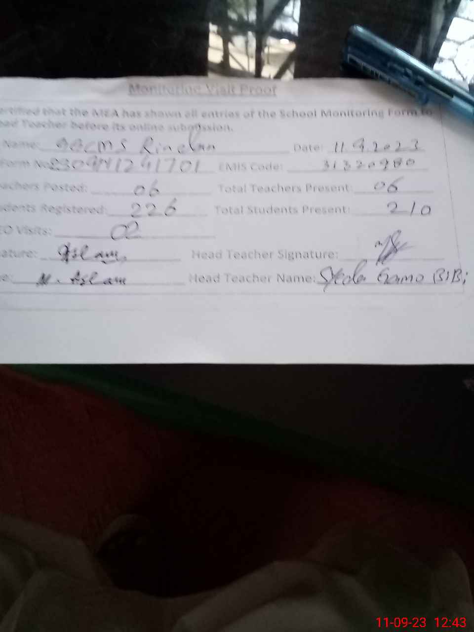 | Attendance Register | Head Teacher | MEA with School | Visit Proof |