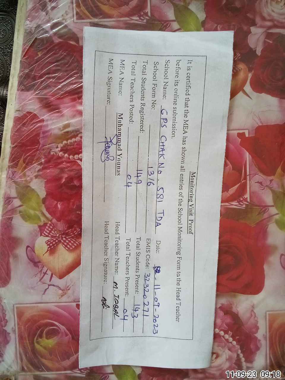 | EMIS Code: 32320271 | Name of School: GPS CHAK NO.581 TDA | |||