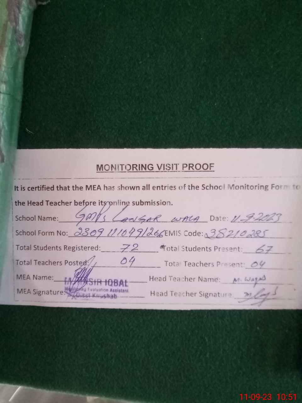 | EMIS Code: 38210285 | Name of School: GMPS LANGAR WALA | |||