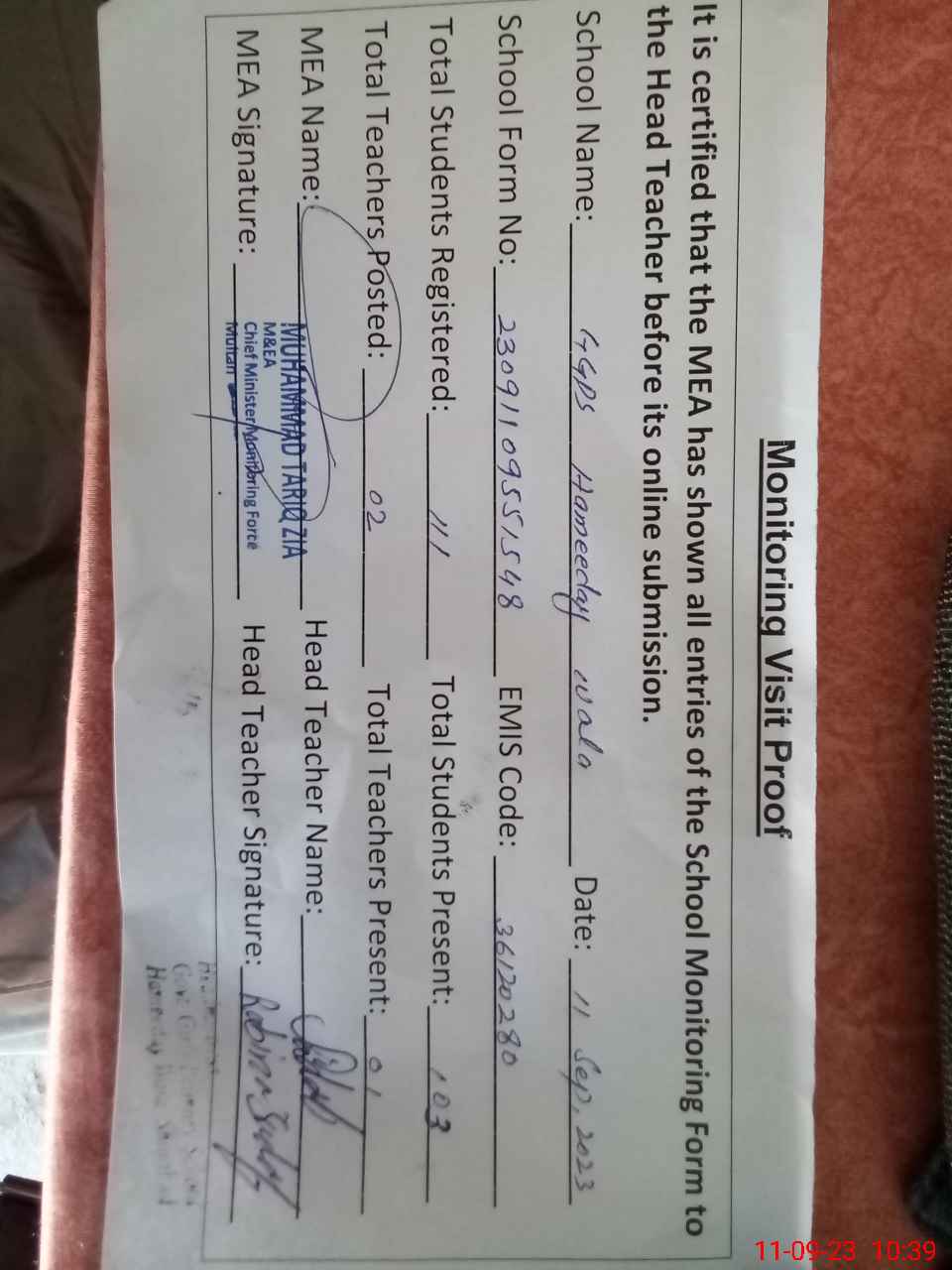| Attendance Register | Head Teacher | MEA with School | Visit Proof |
