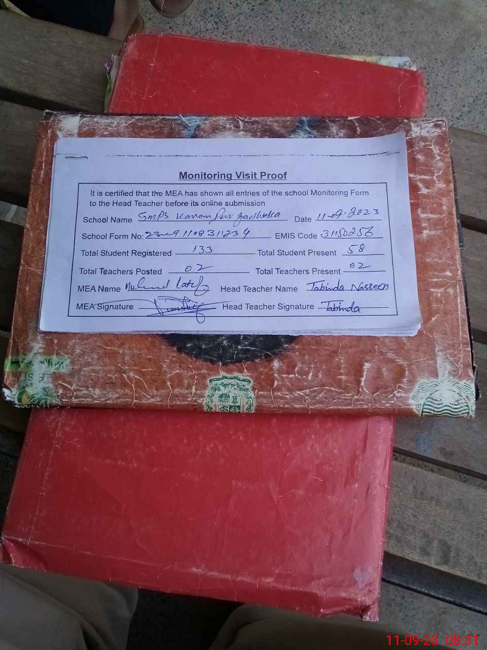 | Attendance Register | Head Teacher | MEA with School | Visit Proof |