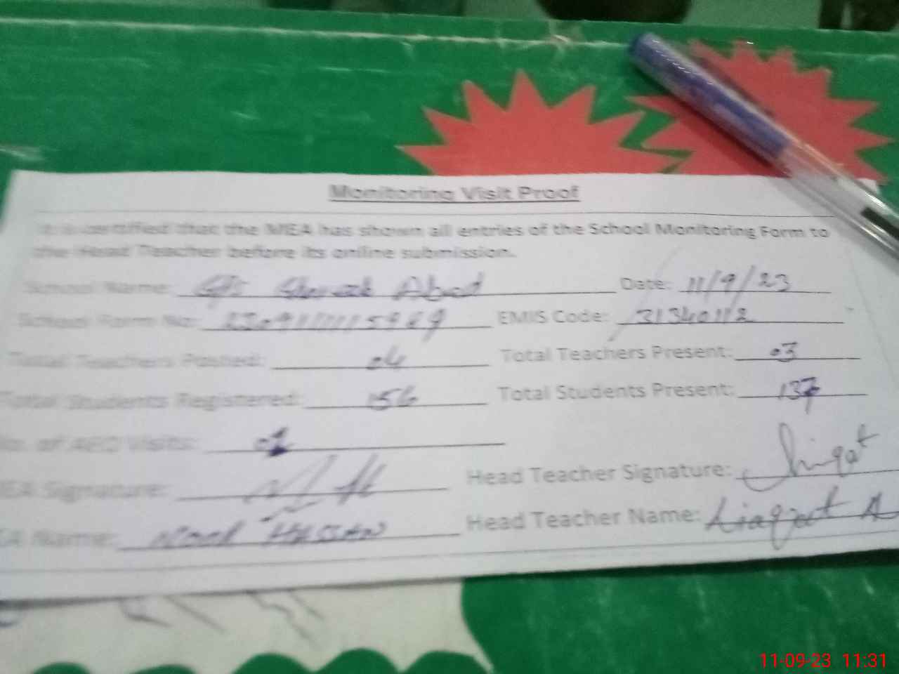 | Attendance Register | Head Teacher | MEA with School | Visit Proof |