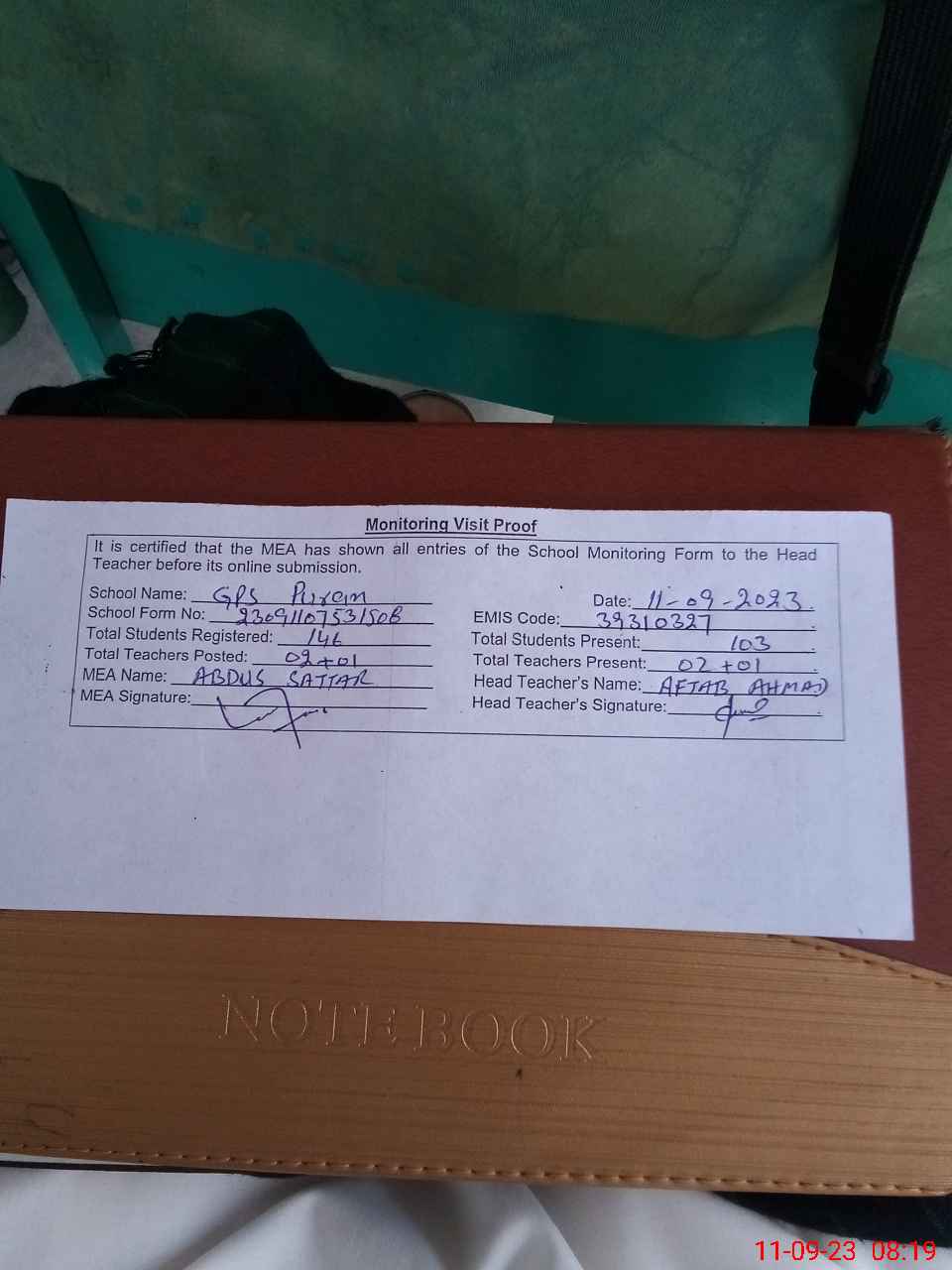 | Attendance Register | Head Teacher | MEA with School | Visit Proof |