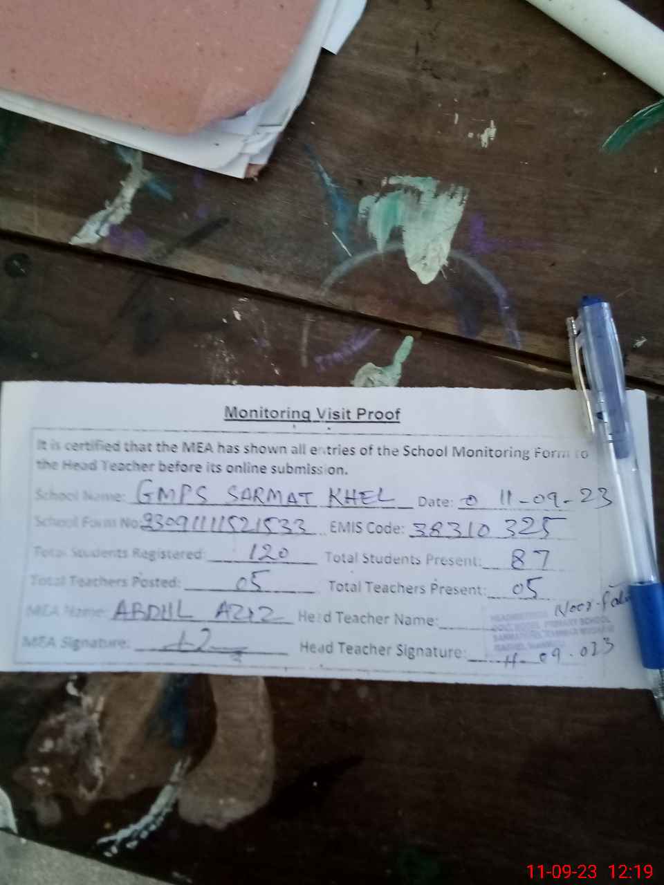 | EMIS Code: 38310325 | Name of School: GMPS SARMAT KHEL | |||
